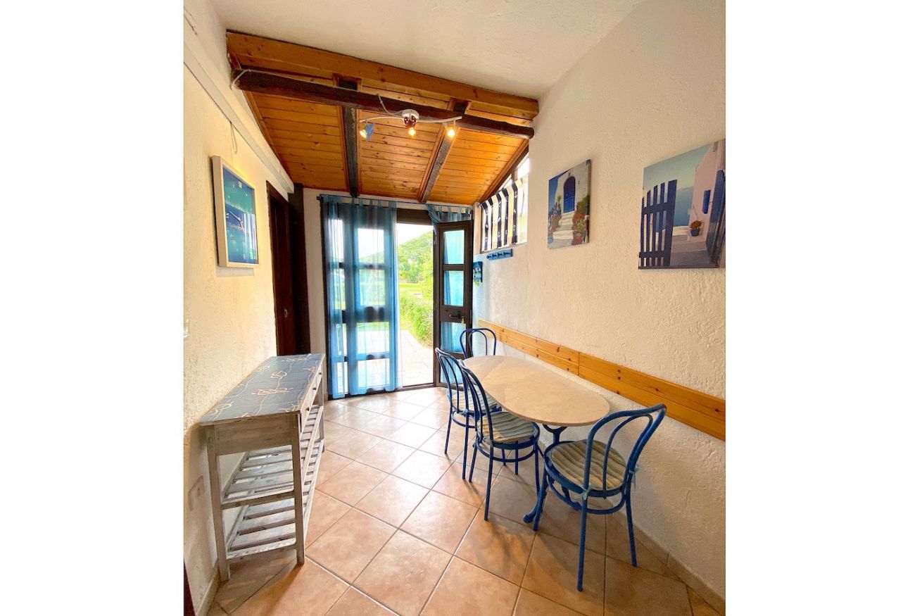 Bilocale al piano terra, composto da una camera da letto matrimoniale e cameretta con letto a castello (entrambe senza finestra), soggiorno e cucinino, tv, lavatrice, aria condizionata, bagno con box doccia, veranda, giardino riservato, posto auto condominiale, lavatrici a gettone all’interno del Residence, docce esterne.